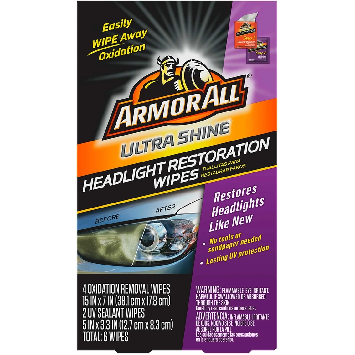 Armor All Ultra Shine Headlight Restoration Wipes easily wipe away oxidation, restoring your headlights like new in two easy steps.