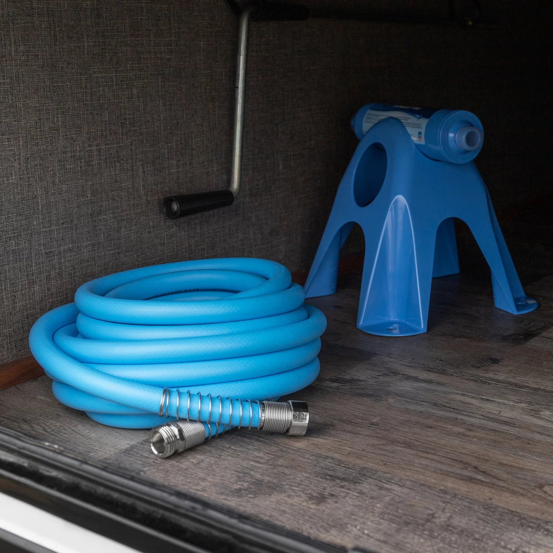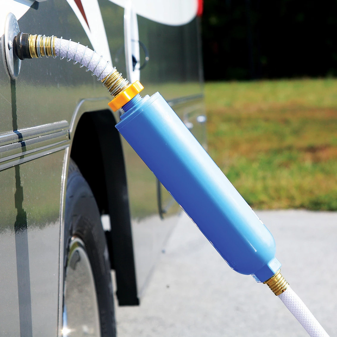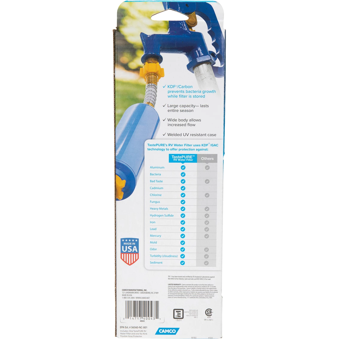 The Camco Taste Pure Water Filter with Flexible Hose Protector reduces bad taste, odor, chlorine and sediment in drinking water with a 20-micron sediment filter. GAC filtration with KDF prevents bacteria. In-line, exterior mount filter has a wide body for increased flow. Flexible hose protector reduces strain. Model: 40043.