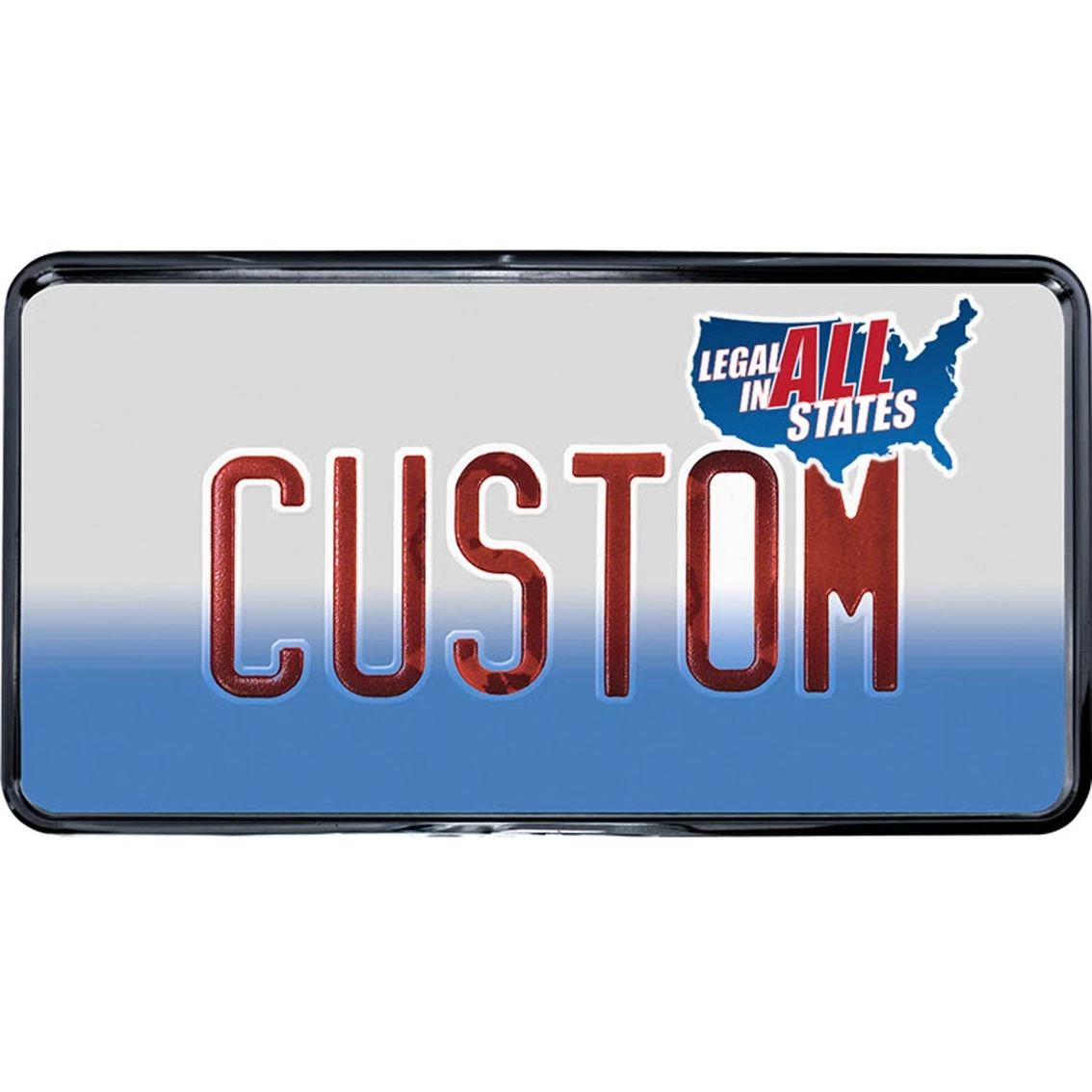 The Black Metal Recessed License Plate Frame from Custom Accessories is designed to allow the license plate to fit inside and will not cover registration stickers making it legal in all states. Frame features universal sizing to fit any U.S. issued license plate and durable metal construction that resists rust and corrosion. Mounting holes allow for quick and simple installation. Model: 92810.