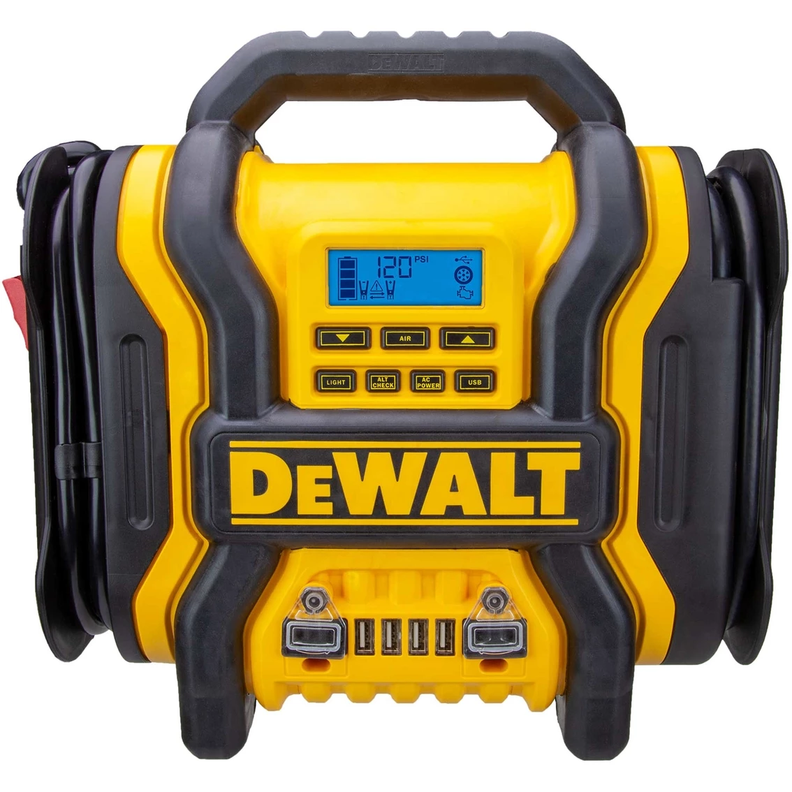 This DeWalt 1400 peak/700 instant Amp Jump-starter with APC switch starts most vehicles in seconds. It includes a 500W AC inverter to plug in an extension cord and 4 USB charging ports to charge personal devices on the go. Use the Digital Compressor to inflate vehicle tires and sports equipment. Model: DXAEPS14.