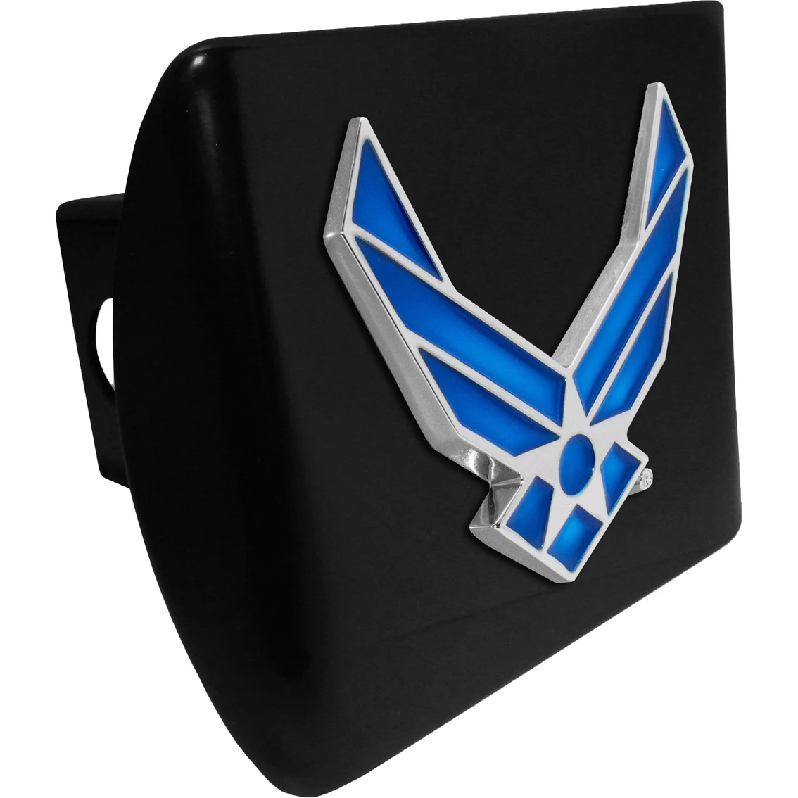 This officially licensed U.S. Air Force Wings all-metal hitch cover by Elektroplate is designed for placement on trailers and measures 5 in. x 3.5 in. It’s comprised of a blue Air Force Wing emblem adhered to a black chrome hitch cover mount. It’s a step above in quality and appearance over cheaper plastic and pewter versions. This hitch cover fits standard 2 in. trailer hitch receivers. Model: AF-WING-PREM-BLK-HC.
