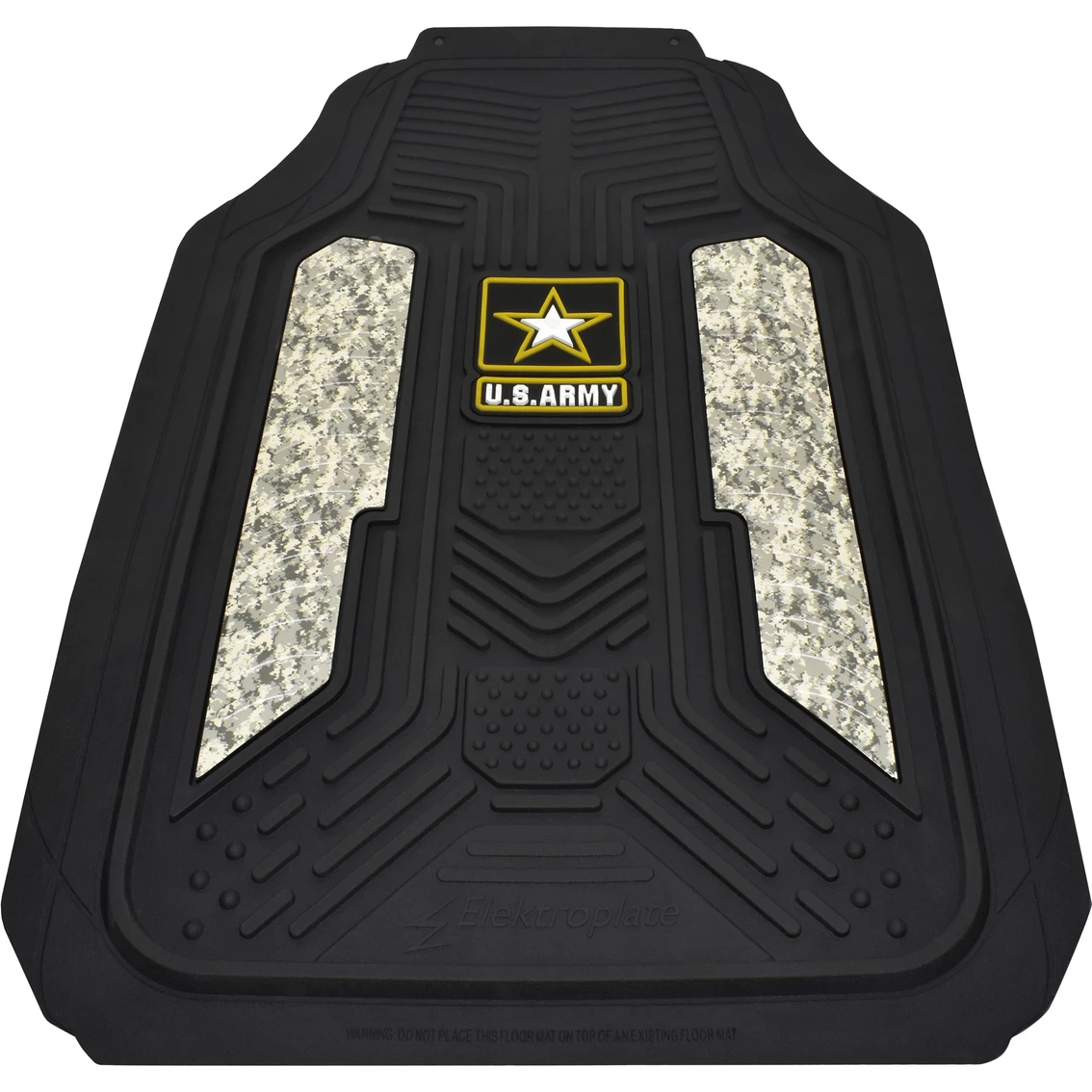 Drive with these Officially licensed U.S. Army heavy duty floor mats (28 x 17.5 in.) by Elektroplate. These premium floor mats feature full color logos with metallic sheen and custom graphics. Easy to clean heavy duty rubber featuring deep channels designed to trap water and dirt. Nibbed backing to secure mat in place for a no slip grip. These mats offer trimmable sides for a perfect universal fit.