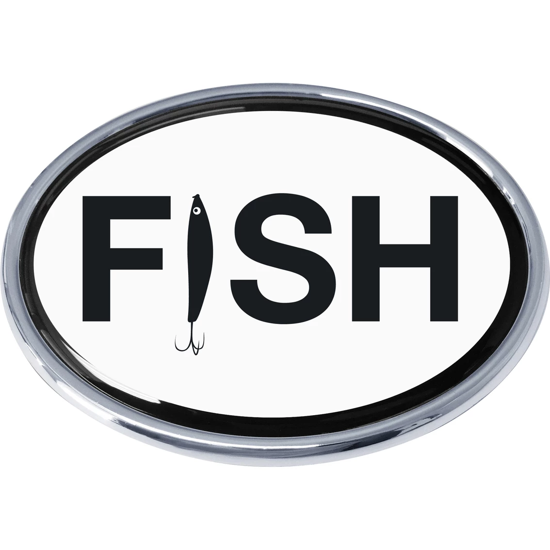 Show your love of fishing on your car or truck with this black and white fish with lure chrome emblem decal from Elektroplate. It is UV-protected with a laminated 0.125-in. thick PVC made to withstand any outdoor conditions. The emblem attaches via paint-safe 3M adhesive foam tape. All Elektroplate car emblems are comprised of a chrome-plated metal finish made to withstand harsh outdoor conditions. This auto emblem will look brand new for years to come (as opposed to cheap imitations that will fade or chip within months of being on your vehicle). Model: FISH-OVAL.
