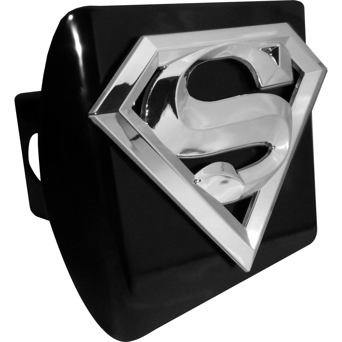 Officially licensed – Superman ALL-METAL hitch cover TM & DC Comics.(s09) (front plate is 5โ x 3.5โ) by Elektroplate. A step above in quality and appearance over cheaper plastic and pewter versions. Comprised of OEM (ABS plastic core with a chrome-plated metal finish) Superman emblem adhered to a black all-metal hitch cover mount. The hitch cover fits standard 2โ trailer hitch receivers Model: SUPER-3D-BLK-HC.