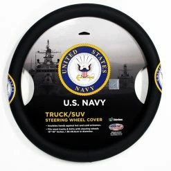 Get the perfect dΓ©cor for your truck or SUV to display your Navy pride! This US Navy steering wheel cover protects your steering wheel with this odorless rubber steering wheel cover with the official Navy emblem located at the 9 and 3 positions. With easy slip on installation no tools are required! Summer and Winter friendly this cover protects your hands from hot and cold extremes. The universal size fits almost all steering wheels between 15 inches β 16 inches.