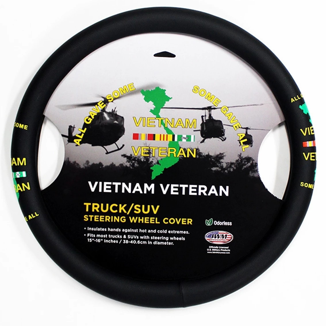 Get the perfect dΓ©cor for your truck or SUV to display your veteran pride! This Vietnam veteran steering wheel cover protects your steering wheel with this odorless rubber steering wheel cover with the official Vietnam vet emblem located at the 9 and 3 positions. With easy slip on installation no tools are required! Summer and Winter friendly this cover protects your hands from hot and cold extremes. The universal size fits almost all steering wheels between 15 inches β 16 inches.