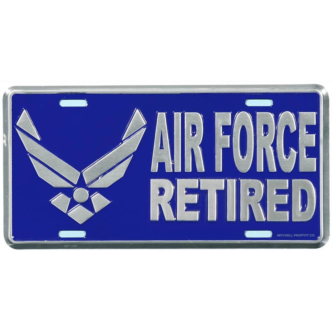This silver on royal blue metal license plate from Mitchell Proffitt includes Air Force Retired in big, bold text and the U.S. Air Force Wing logo. Made in the USA from recycled aluminum.