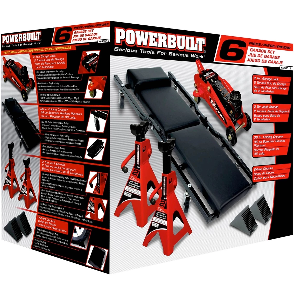 This complete, compact kit from Powerbuilt contains all the essential tools for fast tire changes. Kit includes: 2-ton trolley jack with 5.375 in. to 13 in. lift range, two 2-ton jack stands, 36 in. folding garage creeper and two rubber wheel chocks. Powerbuilt tools are built with the performance, features, fit and finish to satisfy the most demanding users. All Powerbuilt products meet or exceed applicable ASME, ANSI and US government quality standards. Model: 640816.