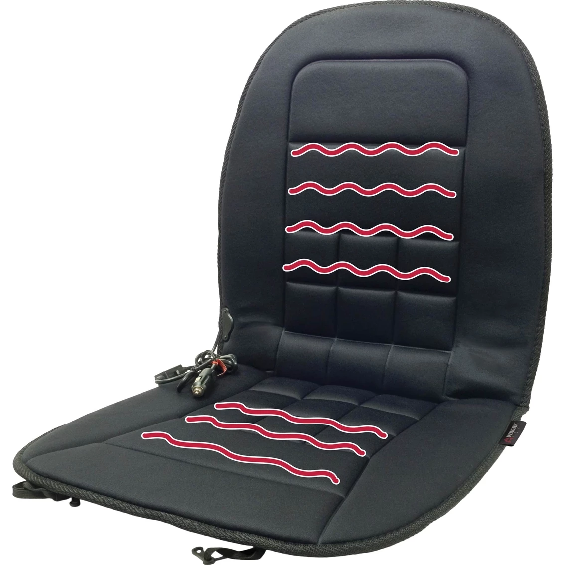 The Heat Comfort 12V Heated Seat Cushion from Wagan Corporation is a full-body cushion with high/low settings for those times when you need extra heat. The Wagan Heated Seat Cushion is perfect for cold weather or winter driving. It provides not only warmth for your back and bottom but also a comfortable seat. This heated seat cushion features a temperature control switch that can be set to either high, low or off so you can find the perfect setting every time. It is powered by the 12V cigarette lighter adapter in your car, and features a 4.3-foot cord for convenient placement. Elastic straps and hooks make it easy to secure this cushion to your seat, and the comfortable polyester cover is easy to clean. This cushion fits most cars, trucks and RVs. An optional AC adapter (sold separately) is available to power the cushion for home or office use. Model: 9738P.