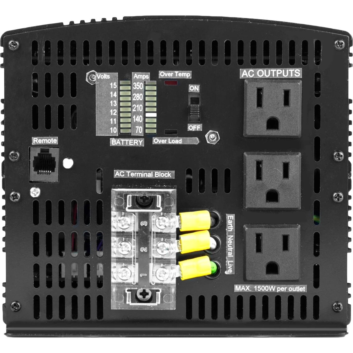 As a venerable favorite among off-grid users, Wagan Tech’s ProLine series of power inverters have received a considerable makeover. Starting from the ground up, the new 3,000 watt inverter with 6,000 watt peak surge received a new SMT circuit board, a glossy exterior coating on the smaller casing, and a massive weight reduction. The new SMT circuit boards offer greater reliability, better efficiency, and fewer stray RF emissions over the older PCB and through-hole boards. From there the case volume shrunk 28 percent of the original, and the overall weight was reduced 36 percent. This makes for one efficient, reliable, beautiful and lightweight 3,000 W inverter in a more compact size. Under the shiny new exterior, you’ll find the aforementioned SMT circuit boards and a powerful cooling fan. On the front of the ProLine 3,000 watt inverter you’ll find the manually operated power switch (on/off) as well as the jack for the remote power switch (included). 3 conveniently stacked 120V AC outlets capable of providing 1500 watts each are well spaced on the right side of the inverter. Just left of the AC outlets, you will find the LED over load and temperature warning lights and the voltage and amperage level indicators. With the stout AC terminal block just below the Voltage/Amperage level indicators, you can be certain that your investment is well protected. On the backside of the ProLine 3000 W inverter is the massive cooling fan. The heavy duty solid mount positive terminal, the heavy duty solid mount negative terminal, and the ground-neutral bond stud with wing nut can be found here. Both of the terminals are now heavy duty solid mounts and come directly out of the case to make connections easier and to avoid the inevitable 90 degree bend that the cables make on traditional inverters, causing undue stress and making connections harder. The massive cooling fan is utilized to help keep the inverter cool and operating efficiently. Wagan Tech builds their inverters with high peak surges that allow 3x the continuous rating to support high surging appliances such as tools, microwaves, air conditioners and refrigerators. Wagan Tech uses top quality components and reliable MOSFET transistors – the key factor in reliable manufacturing. Includes remote switch and instruction manual. Model: 3742.